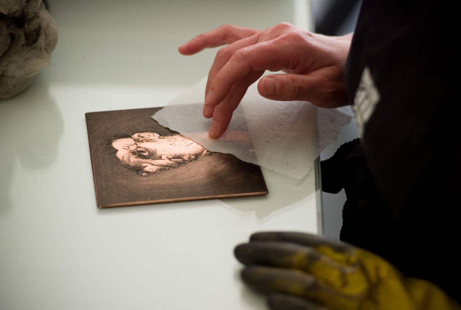 This weekend class will be a great introduction to etching. Etching is an intaglio method of printmaking where an acid resistant ground is applied to the surface of a plate which is then drawn into revealing the metal plate underneath. The plate is then submerged in acid which bites the open areas into the plate. These etched areas sit below the surface of the metal plate and hold the ink ready for printing using an etching press. Working directly onto a steel plate you will develop images through various hand applied techniques, learn how to ink and print the plate using our Rochat printing press and finish the weekend with a small edition of prints.
