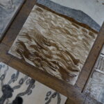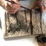 Mokulito, also known as wood litho, is a unique form of printmaking developed in Japan in the 1970’s. The process uses plywood as the printing surface, and draws on the principles of lithography, specifically the antipathy between grease and water. Greasy materials are used to draw and paint imagery on the sanded plywood matrix before being processed. Using wood allows additional marks to be cut into the surface, as with relief printing. When printed, the drawn and cut marks sit together with the ghostly wood grain impressions which becomes more obvious each time the plate is printed, until the plate eventually fills in. The nature of using wood means the prints will all vary a little and create a small edition.
